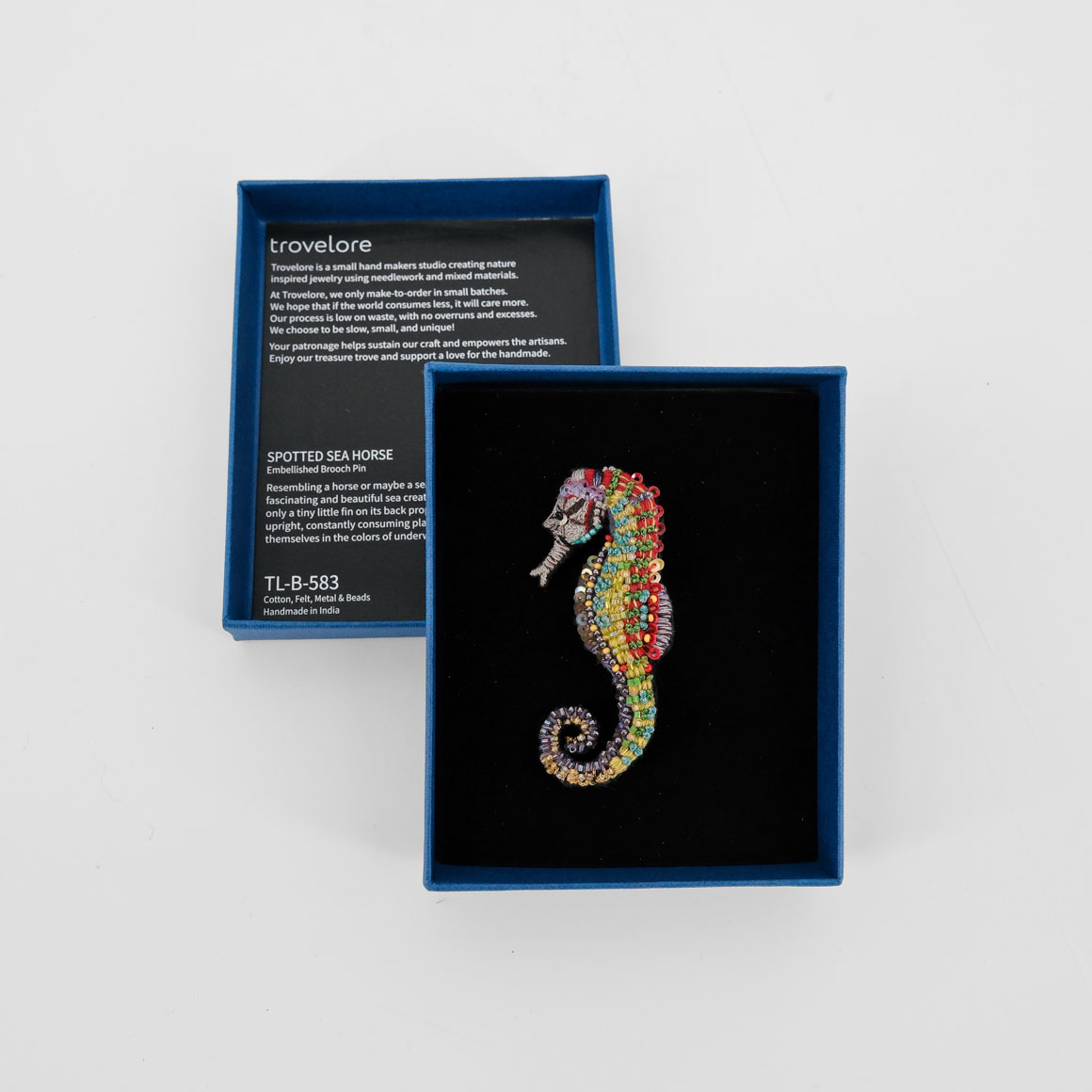 Die wunderschönen Trovelore Broschen werden in Delhi in einem eigenen Stickerei-Atelier hergestellt. Es ist ein von Frauen geführtes Atelier, das sich um die Ausbildung und das Engagement in der Stickereikunst bemüht und dafür sorgt, dass Techniken und Fertigkeiten weiter lebendig gehalten werden. Das Projekt garantiert den Mitarbeiterinnen ein geregeltes überdurchschnittliches Einkommen sowie grosszügige Sozialversicherungen.